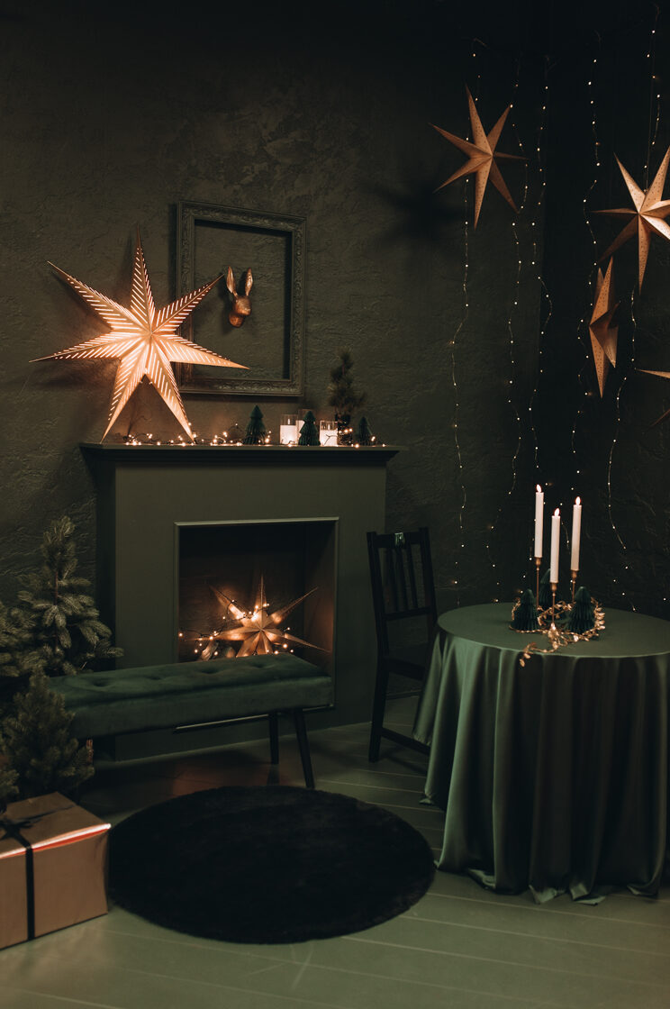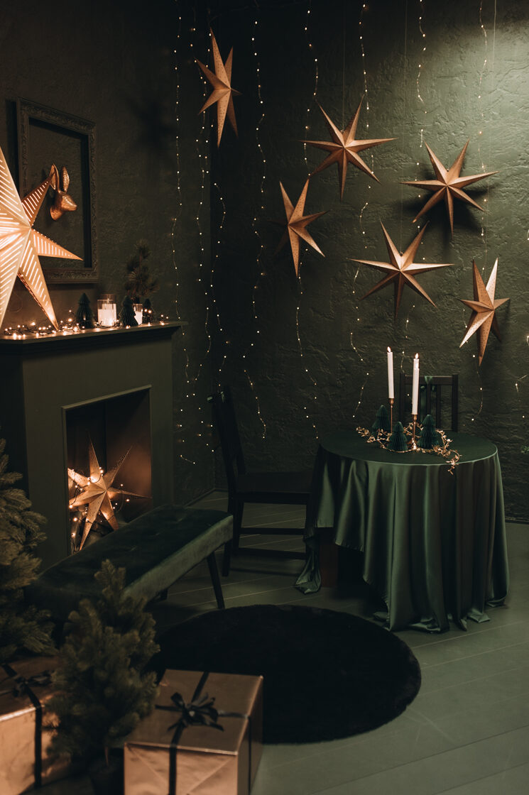 - Klasiskā tumši zaļā zona ar kamīnu un galdu